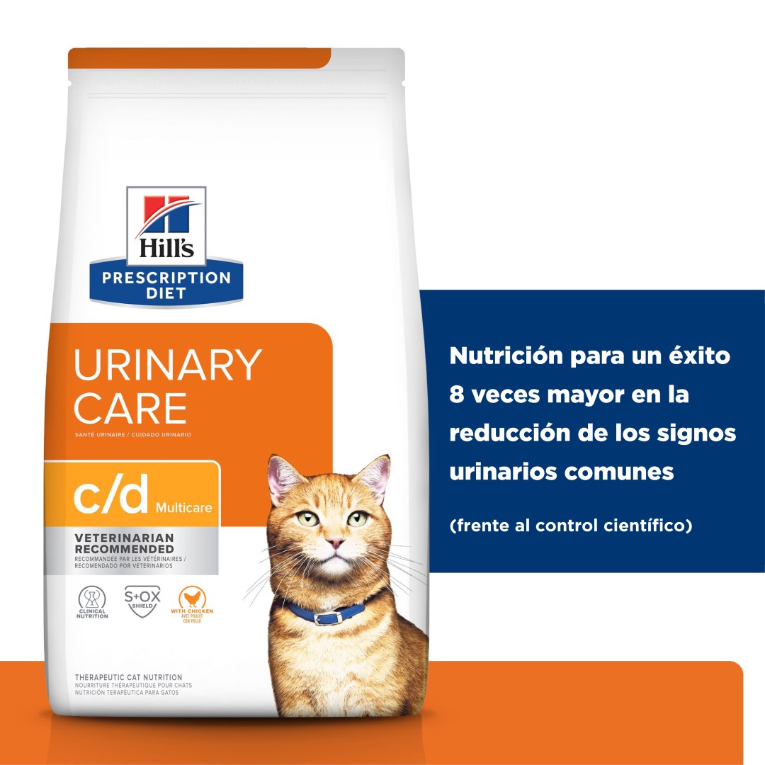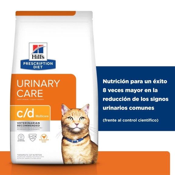 Los nutricionistas y veterinarios de Hill's desarrollaron Prescription Diet c/d Multicare nutrición clínica especialmente formulada para apoyar la salud urinaria de un gato. De hecho, c/d Multicare es una nutrición clínicamente probada para reducir la tasa de recurrencia de los signos urinarios más comunes en un 89 %. Este alimento seco está elaborado con pollo y tiene un sabor irresistible que a tu gato le encantará.