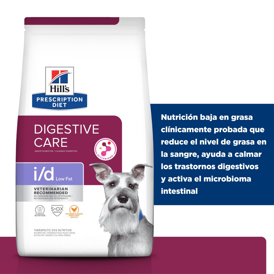 Hill's Prescription Diet i/d Low Fat Dry Dog Food está especialmente formulado para perros que requieren un alimento altamente digerible con bajos niveles de grasa para apoyar la salud digestiva y el bienestar. También está fortificado con la innovadora tecnología de ingredientes ActivBiome+ de Hill, que ha demostrado clínicamente que activa rápidamente el microbioma intestinal para respaldar la salud y el bienestar digestivos. Este alimento seco tiene un irresistible sabor a pollo que encanta a los perros.