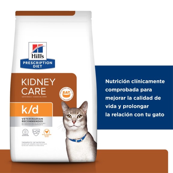 Los nutricionistas y veterinarios de Hill's desarrollaron la nutrición clínica Hill's Prescription Diet k/d para ayudar a proteger la función renal vital de su gato, mejorar el apetito y aumentar la ingesta de alimentos. Este alimento seco está elaborado con pollo y tiene un sabor irresistible que a tu gato le encantará. De hecho, la nutrición de Prescription Diet k/d está clínicamente probada para mejorar y alargar la calidad de vida.