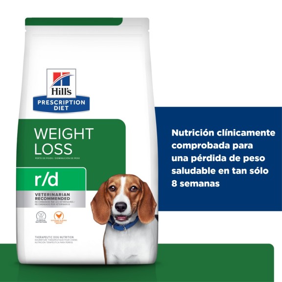 Los nutricionistas y veterinarios de Hill's desarrollaron la nutrición clínica Prescription Diet r/d especialmente formulada para apoyar la pérdida de peso de los perros. De hecho, r/d es una nutrición clínicamente probada para una pérdida de peso saludable en solo 8 semanas. Este alimento seco tiene un irresistible sabor a pollo que encanta a los perros.