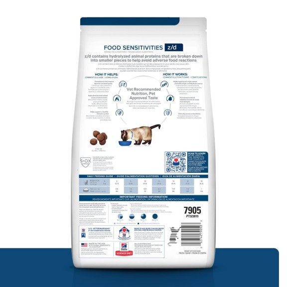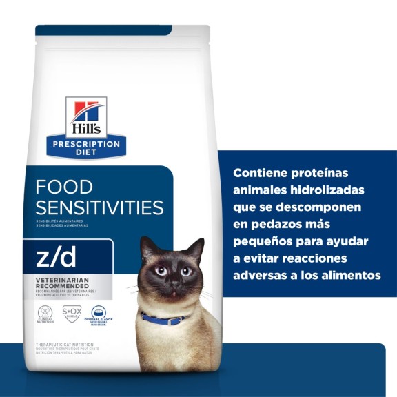 Nutricionistas y veterinarios de Hill's desarrollaron Prescription Diet z /d nutrición clínica especialmente formulada para apoyar la sensibilidad alimentaria de un gato y para ayudar a evitar reacciones adversas a los alimentos.