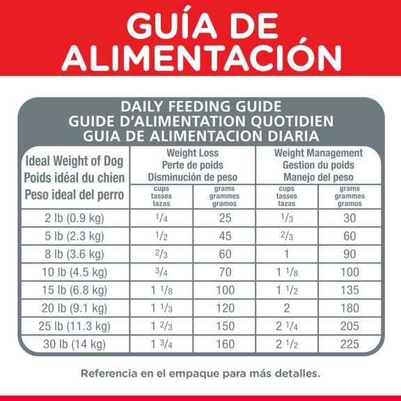 Se recomienda para: Perros adultos 1-6 años de edad que pesen hasta 25 libras en su máximo crecimiento y que requieren menos calorías (i.e. perros menos activos, esterilizados o propensos al aumento de peso).