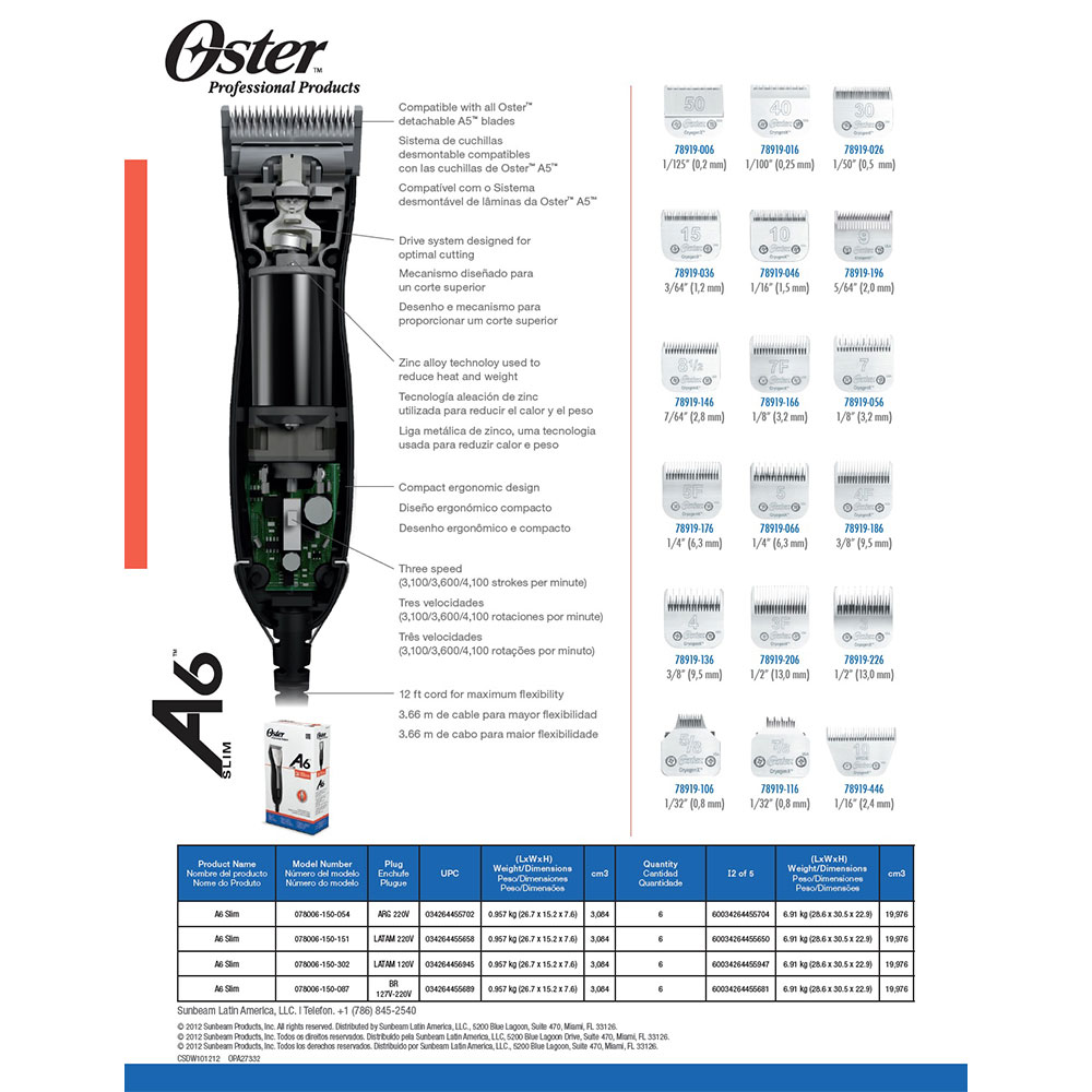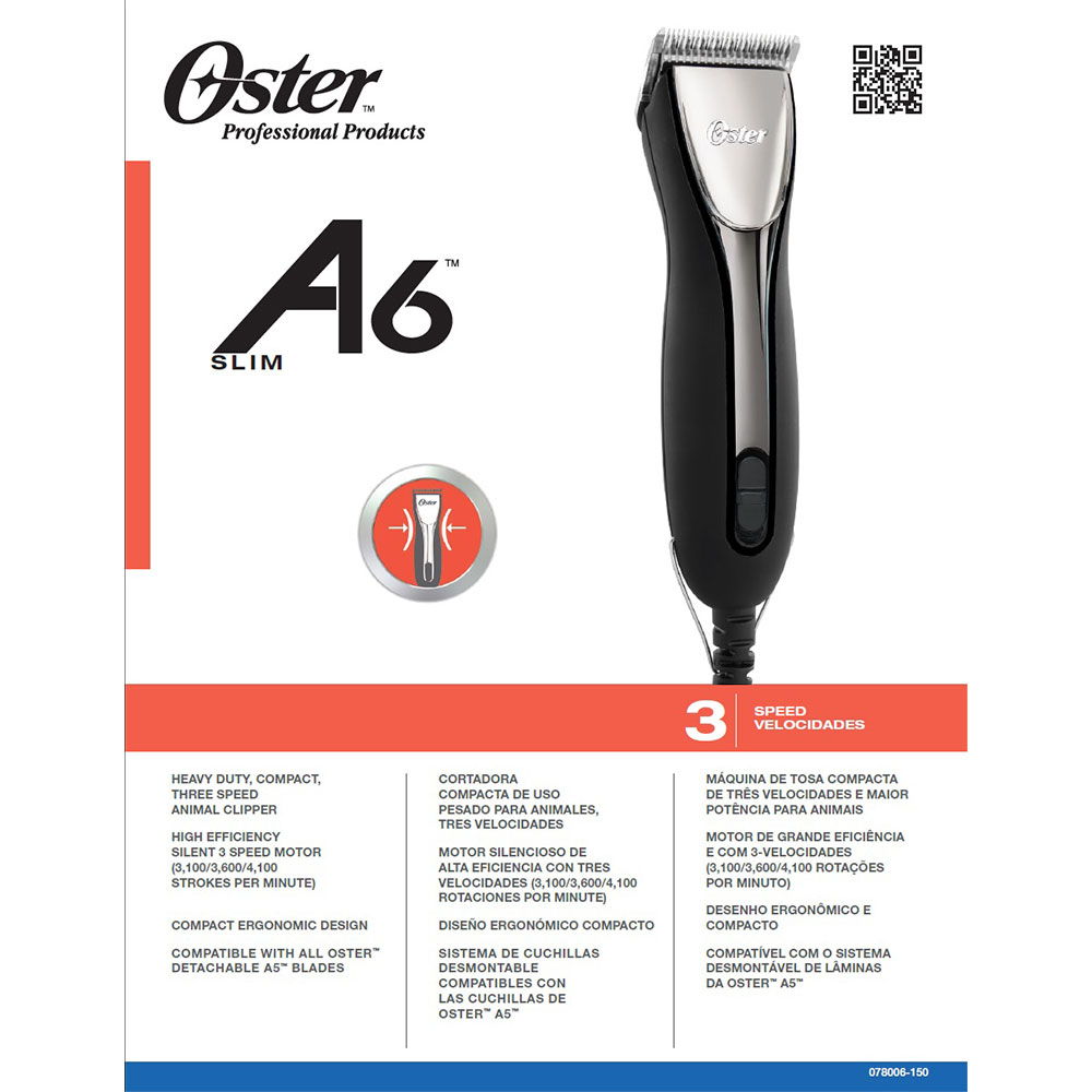 La cortadora de 3 velocidades más delgada Oster® A6® combina el diseño ergonómico más compacto jamás construido con un motor de alta eficiencia, resistente y sintonizado con precisión que funciona a más de 4000 SPM.